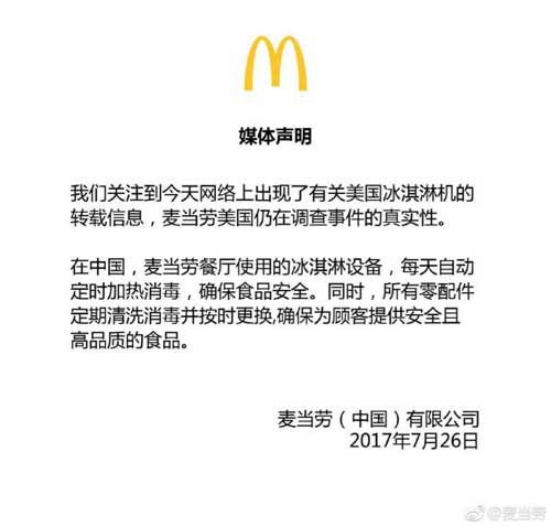 7月26日23時(shí)許,麥當(dāng)勞官方微博發(fā)布了《關(guān)于美國(guó)冰淇淋機(jī)的媒體聲明》:“我們關(guān)注到今天網(wǎng)絡(luò)上出現(xiàn)了有關(guān)美國(guó)冰淇淋機(jī)的轉(zhuǎn)載信息,麥當(dāng)勞美國(guó)仍在調(diào)查事件的真實(shí)性。在中國(guó),麥當(dāng)勞餐廳使用的冰淇淋設(shè)備,每天自動(dòng)定時(shí)加熱消毒,確保食品安全。同時(shí),所有零配件定期清洗消毒并按時(shí)更換,確保為顧客提供安全且高品質(zhì)的食品。”